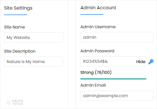 • Admin Username: Your new Nibbleblog username (for security reasons, do not use the administrator or the admin username).