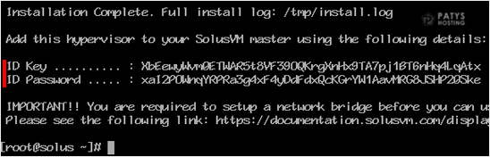 Step 3: Once it completes, it will show you the Slave keys and further instructions for your virtualization type. You can now use these keys to add a node to your SolusVM Master panel. You will need to have a SolusVM Slave license for each node.